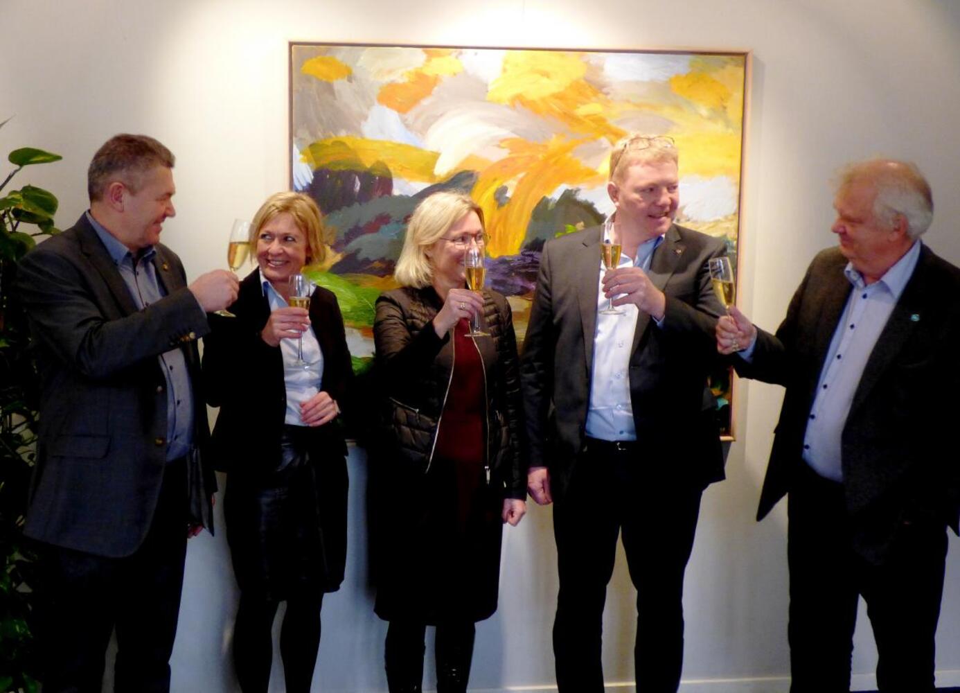 Foto: Forbundssekretær i Dansk El-forbund Ole Tue Hansen, juridisk chef i Arbejdsgiverne Anne Vibeke Gregersen, direktør i Arbejdsgiverne Jani Lykke Methmann, formand for Arbejdsgiverne Fleming Frederiksen og forbundsformand i Dansk El-Forbund Jørgen Juul Rasmussen indgik aftale om en ny overenskomst.