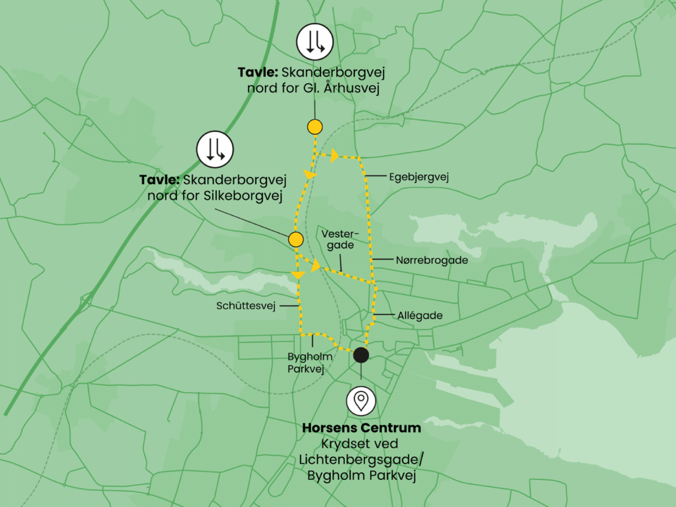 Fire af tavlerne viser de hurtigste ruter for bilister, der skal ind til Horsens centrum. På Skanderborgvej er opsat en tavle nord for Gammel Århusvej, som viser, om det er hurtigst at blive på Skanderborgvej eller at køre til venstre ad Gl. Århusvej og videre ad Egebjergvej. Lige før krydset ved Skanderborgvej og Silkeborgvej viser en ny tavle, om det er en fordel at køre ligeud ad Schüttesvej eller til venstre ad Vestergade.