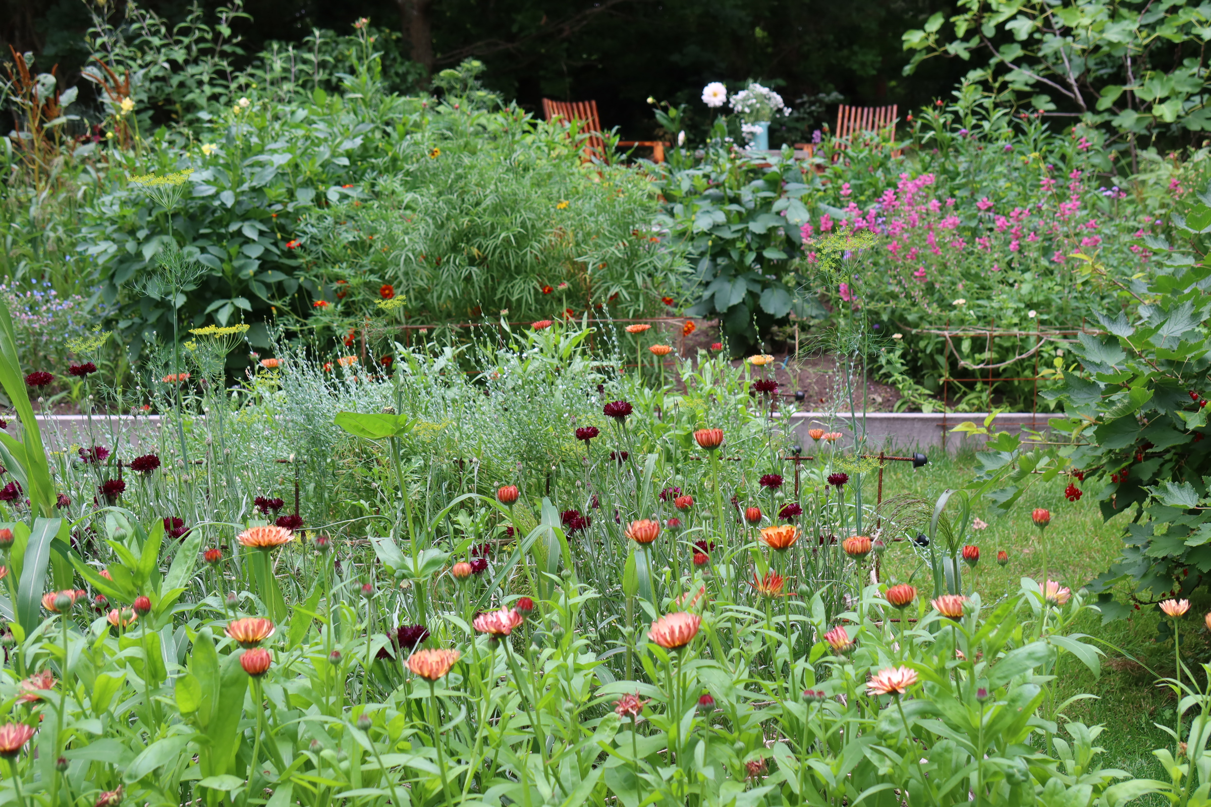 Her er der selvforsyning med blomster til buketter fra den frodige skærehave, og i det eksotiske hjørne er der indrettet planteeksperimentarium med planter, man normalt ikke ser under danske himmelstrøg. Det er planteglæden, der driver værket, og der er altid nye haveprojekter i gang.