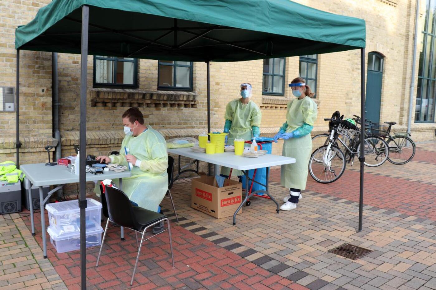 Tirsdag kl. 9.00 blev de første ansatte testet foran Ceres Centret. Blandt dem var personalet fra plejecentret Orions Hus, der ligger på Fabrikvej lige i nærheden. De var hurtigt på banen, da de skulle på tur med deres beboere og lige kunne nå testen, inden de skulle af sted.