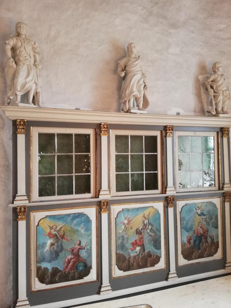 Efter ægteskabet med Margaretha overmales antageligt adelvåbner og slynget monogram for Rudolf og Elisabeth Margaretha på herskabsstolen og erstattes med billeder af ”Saligprisningerne” fra Mathæus evang. Kap. 5, vers 3-11, udført efter en tysk billedbibel fra 1690´erne af Christoph Weigels ”Biblia ectypa”.