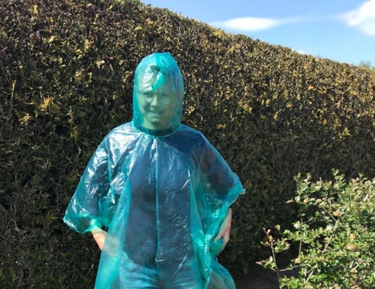 Lone har fundet en løsning: Engangsregnfrakker og fortæller med et stort smil i hele ansigtet.