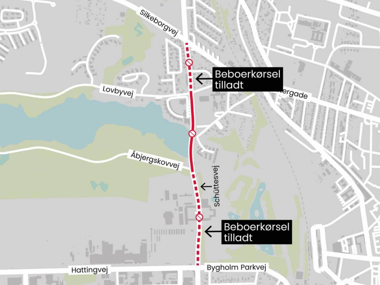 For beboere og bilister, der har ærinde i området, vil det fortsat være muligt at køre ind i området. Det gælder på strækningen fra krydset ved Silkeborgvej/Skanderborgvej og hen til krydset ved Lovbyvej samt fra krydset ved Bygholm Parkvej og hen til lige før Åbjergskovvej.