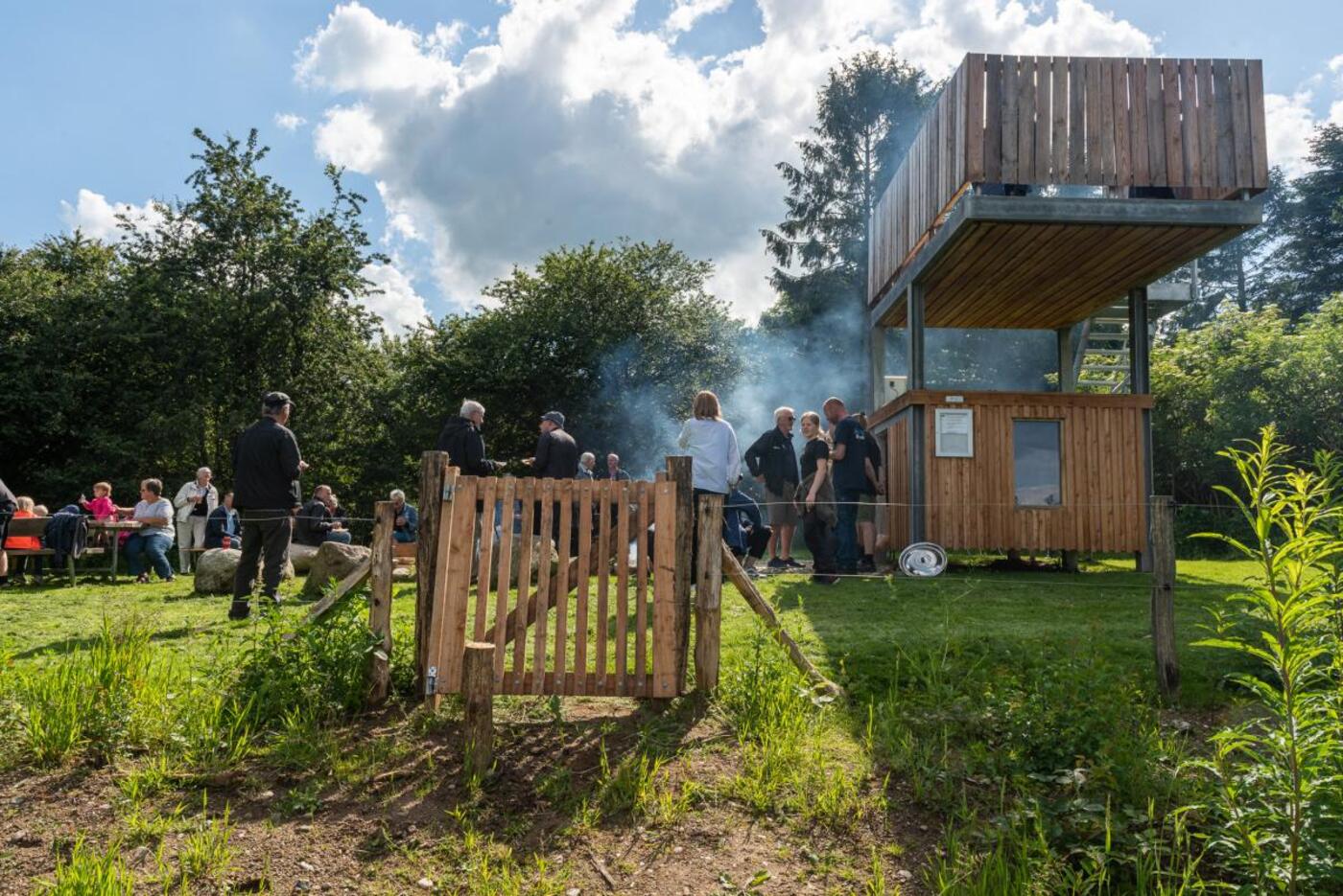 Fredag 21. juni blev fugle og stjernekiggertårn, samt tilhørende shelter officielt indviet og den grønne rydning i skoven med den imponerede udsigt var fyldt med gæster og talere. På bålpladsen havde man tændt op under gryderne og der var lavet en kæmpe portion pasta med kødsovs, og der var øl og vand til alle.