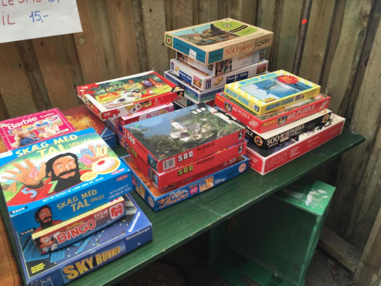 Butikken i Tvingstrup har i sit indleverings-skur sat et bord frem med spil og puslespil til høflig selvbetjening.