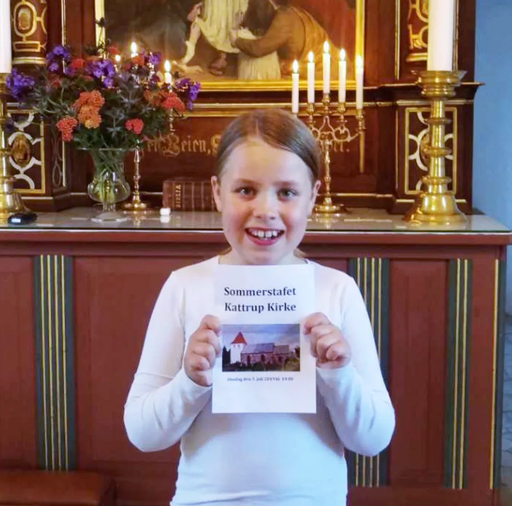 Sommerstafet er et arrangement for alle aldre – således var Benedicte, der efter sommerferien skal begynde i 3. klasse på Hovedgård Skole, og hendes mor blandt de mange, der var mødt frem i Kattrup Kirke. De to var hoppet på deres cykler på denne onsdag aften for at deltage i sommerstafetten i deres lokale kirke, og begge nød aftenen, der ud over fællessang og historiefortælling også bød på efterhygge og snak i våbenhuset.