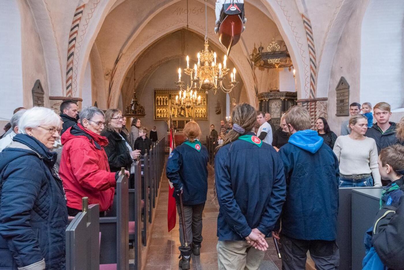 Da det sidste slag havde lydt fra kirkeklokken, bød sognepræst Lone Buhl spejderne indenfor i kirken og der kunne afholdes gudstjeneste for spejderne og som en ekstra bonus var der også en barnedåb i dagens anledning.